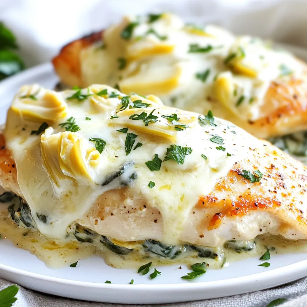 - 4 boneless, skinless chicken breasts - 1 cup fresh spinach, finely chopped - 1 cup canned artichoke hearts, drained and roughly chopped - 1 cup cream cheese, softened - ½ cup sour cream - 1 cup shredded mozzarella cheese - 2 cloves garlic, minced - 1 teaspoon onion powder - Salt and pepper to taste - 2 tablespoons olive oil - ¼ teaspoon red pepper flakes (optional) - Fresh parsley, chopped For this creamy spinach artichoke chicken, I use simple and fresh ingredients. The chicken breasts give a nice base. The spinach and artichokes add color and flavor. Cream cheese and sour cream create a rich sauce. Shredded mozzarella melts beautifully on top. Fresh garlic and onion powder enhance the taste. Salt and pepper make everything pop. Olive oil helps to sear the chicken. Red pepper flakes give a hint of heat, but you can skip them if you prefer mild dishes. Lastly, fresh parsley brightens up the dish, adding a touch of color and freshness. {{ingredient_image_2}} - Preheat oven to 375°F (190°C). - In a bowl, mix cream cheese and sour cream until smooth. - Fold in spinach, artichokes, garlic, onion powder, salt, pepper, and red pepper flakes. - Heat olive oil in an oven-safe skillet over medium-high heat. - Sear chicken breasts for about 5 minutes on each side. - Once browned, remove chicken and set aside. - Pour the creamy spinach-artichoke mixture into the skillet. - Nestle chicken breasts back in the skillet and top with mozzarella cheese. - Cover the skillet with a lid or foil. - Bake for 20-25 minutes until chicken reaches 165°F (75°C). - For a crispy finish, uncover and broil for 2-3 minutes. How to avoid overcooking the chicken To avoid dry chicken, watch the cooking time closely. Sear each side for about five minutes. This creates a nice golden crust. Use a meat thermometer to check doneness. The chicken should reach 165°F (75°C) inside. If you have a thick piece, it may need a bit longer. Always remember to let it rest before serving. Tips for achieving the best creamy texture For a smooth creamy texture, make sure the cream cheese is soft. Let it sit at room temperature before mixing. When you blend it with sour cream, stir well until there are no lumps. Adding the spinach and artichokes should be done gently. This keeps the mixture airy and light. If you want extra creaminess, consider adding a splash of milk or heavy cream. What to serve with Creamy Spinach Artichoke Chicken This dish pairs great with fluffy rice or pasta. The sauce soaks into the grains beautifully. You can also serve it with roasted vegetables for a balanced meal. A fresh salad on the side adds crunch and color. Try a simple garden salad or a Caesar salad for a nice touch. Garnishing ideas with fresh herbs Fresh parsley adds a bright touch. Sprinkle it on before serving for a pop of color. You might also try basil or chives for a different flavor. Just chop them finely and sprinkle on top. This makes the dish look fancy and fresh! Pro Tips Use Fresh Ingredients: Whenever possible, opt for fresh spinach and artichoke hearts for a vibrant flavor and better texture in your dish. Perfectly Cooked Chicken: Use a meat thermometer to ensure your chicken reaches an internal temperature of 165°F (75°C) for juicy and tender results. Customize the Heat: Adjust the amount of red pepper flakes to suit your taste, or substitute with fresh jalapeños for a different twist. Rest Before Serving: Allow the dish to rest for a few minutes after baking; this helps the flavors meld and makes for easier serving. {{image_4}} You can swap chicken for other proteins. Try using turkey or pork. If you want to go meatless, mushrooms work great. They add a nice texture and soak up flavors well. You can use portobello or cremini mushrooms for a hearty bite. To add more flavor, consider using spices like garlic powder, paprika, or even a dash of lemon zest. Fresh herbs like thyme or basil can elevate the dish. For the creaminess, try different cheeses. Creamy goat cheese or sharp cheddar gives a unique twist. Just remember to adjust the salt since some cheeses are saltier. To keep your Creamy Spinach Artichoke Chicken fresh, store it in an airtight container. Make sure to cool it down first before sealing it up. This helps lock in flavors and moisture. Place the container in the fridge right away. Your leftovers will stay good for about 3 to 4 days. When you're ready to enjoy your leftovers, use the oven or a microwave to reheat. For the oven, preheat it to 350°F (175°C). Place the chicken in a baking dish and cover it with foil. This keeps the chicken moist while it warms up. Bake for about 15 to 20 minutes or until it’s hot. In the microwave, use a microwave-safe dish and cover it loosely. Heat in short bursts of 1 to 2 minutes. Stir halfway through to ensure even heating. If you want to keep it creamy, add a splash of water or broth. This will help prevent it from drying out. Enjoy your tasty dish again! How do I know when the chicken is cooked? You can check the chicken with a meat thermometer. It should reach 165°F or 75°C. This ensures that it is safe to eat. If you don't have a thermometer, cut into the chicken. The meat should be white, not pink. Can I make this dish ahead of time? Yes, you can prepare the creamy spinach-artichoke mixture a day before. Just store it in the fridge. You can also sear the chicken ahead of time. When ready, combine and bake it as directed. Is it possible to use frozen spinach? Absolutely! Frozen spinach works well. Just make sure to thaw and drain it first. This helps avoid excess water in the dish. What can I substitute for mozzarella cheese? You can use provolone, gouda, or cheddar cheese. Each gives a different flavor. Choose one that you enjoy! Is this dish suitable for meal prep? Yes, this dish is great for meal prep. Store portions in airtight containers. It stays fresh in the fridge for about 3-4 days. Just reheat when ready to eat. This blog post showed you how to make Creamy Spinac