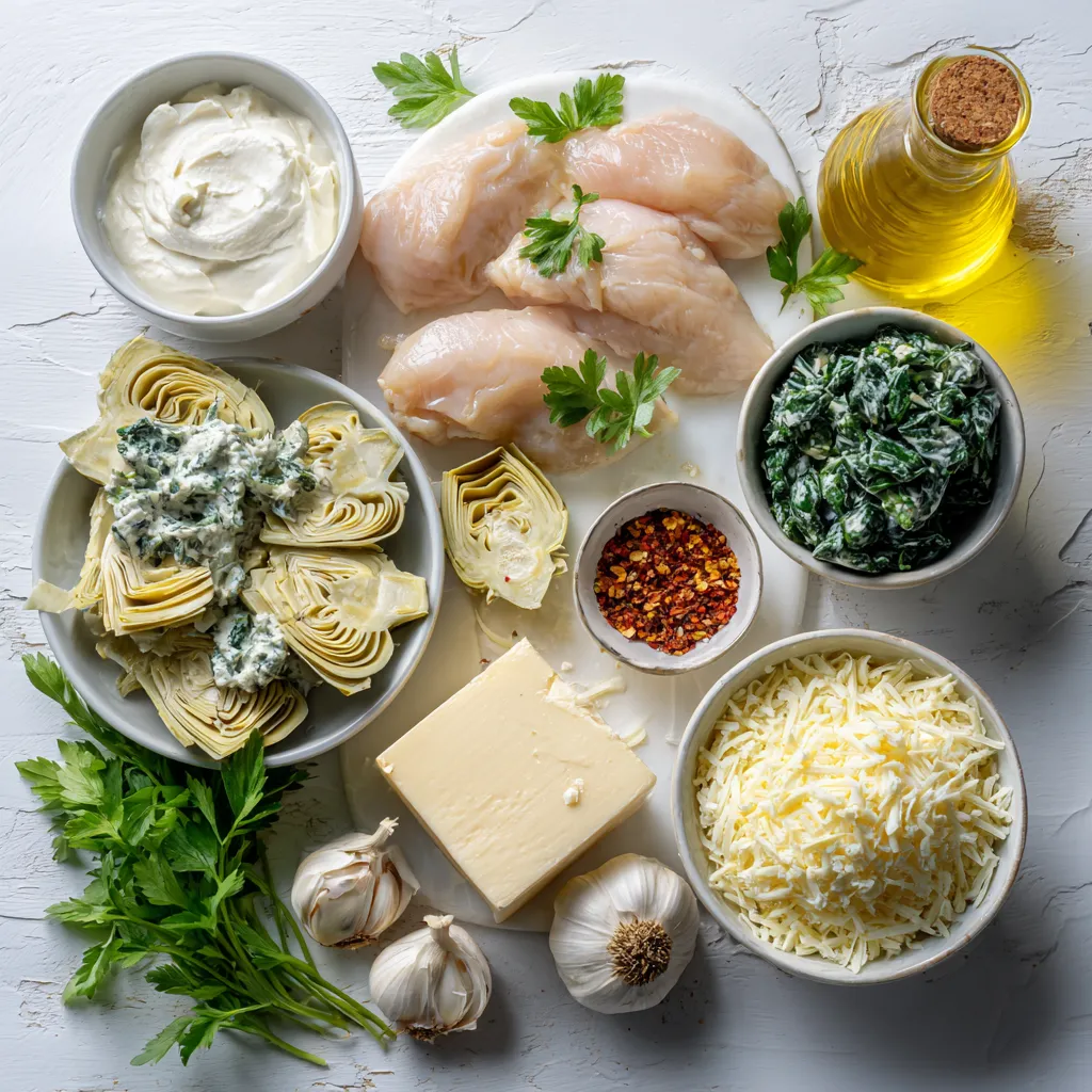 For this creamy spinach artichoke chicken, I use simple and fresh ingredients. The chicken breasts give a nice base. The spinach and artichokes add color and flavor. Cream cheese and sour cream create a rich sauce. Shredded mozzarella melts beautifully on top. Fresh garlic and onion powder enhance the taste. Salt and pepper make everything pop. Olive oil helps to sear the chicken. Red pepper flakes give a hint of heat, but you can skip them if you prefer mild dishes. Lastly, fresh parsley brightens up the dish, adding a touch of color and freshness.