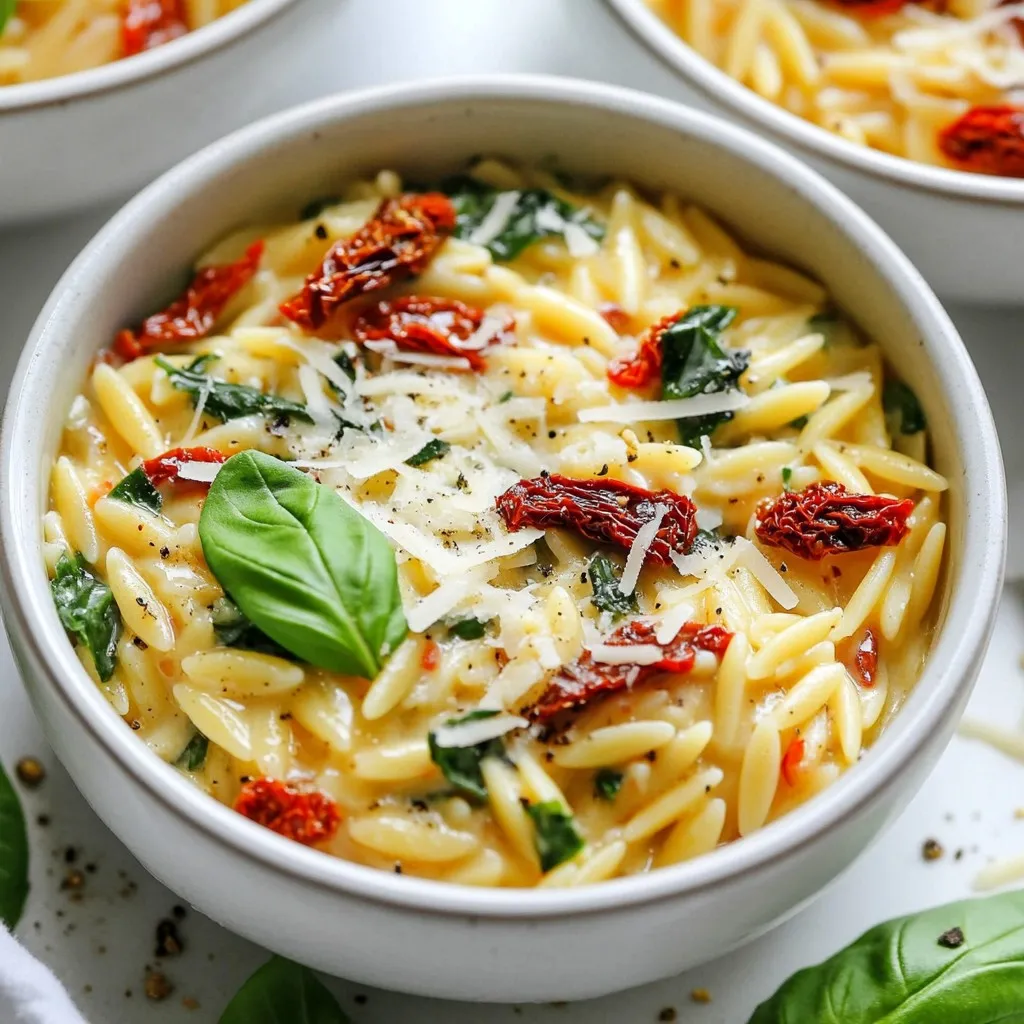 A rich and creamy orzo dish featuring sun-dried tomatoes and fresh spinach, perfect for a comforting meal.