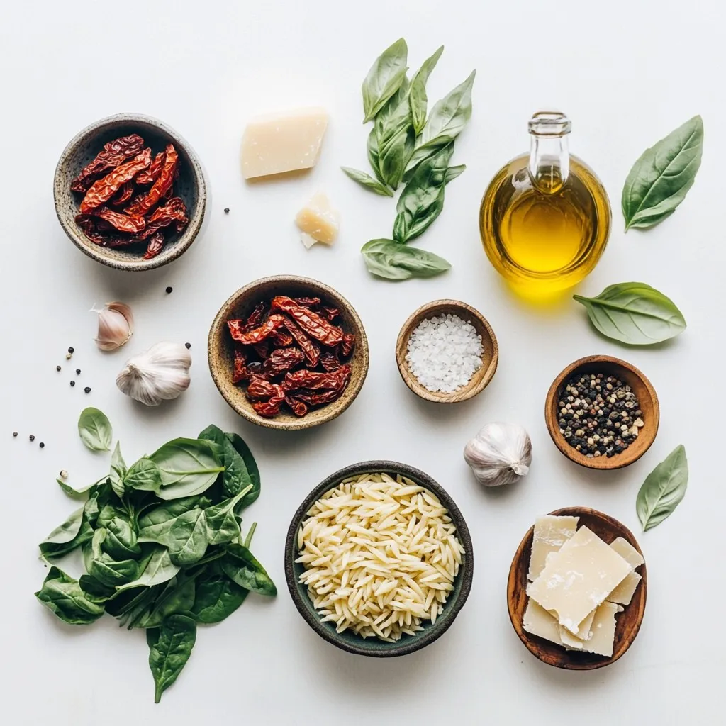 Keyword creamy, orzo, spinach, sun-dried tomatoes, vegetarian
