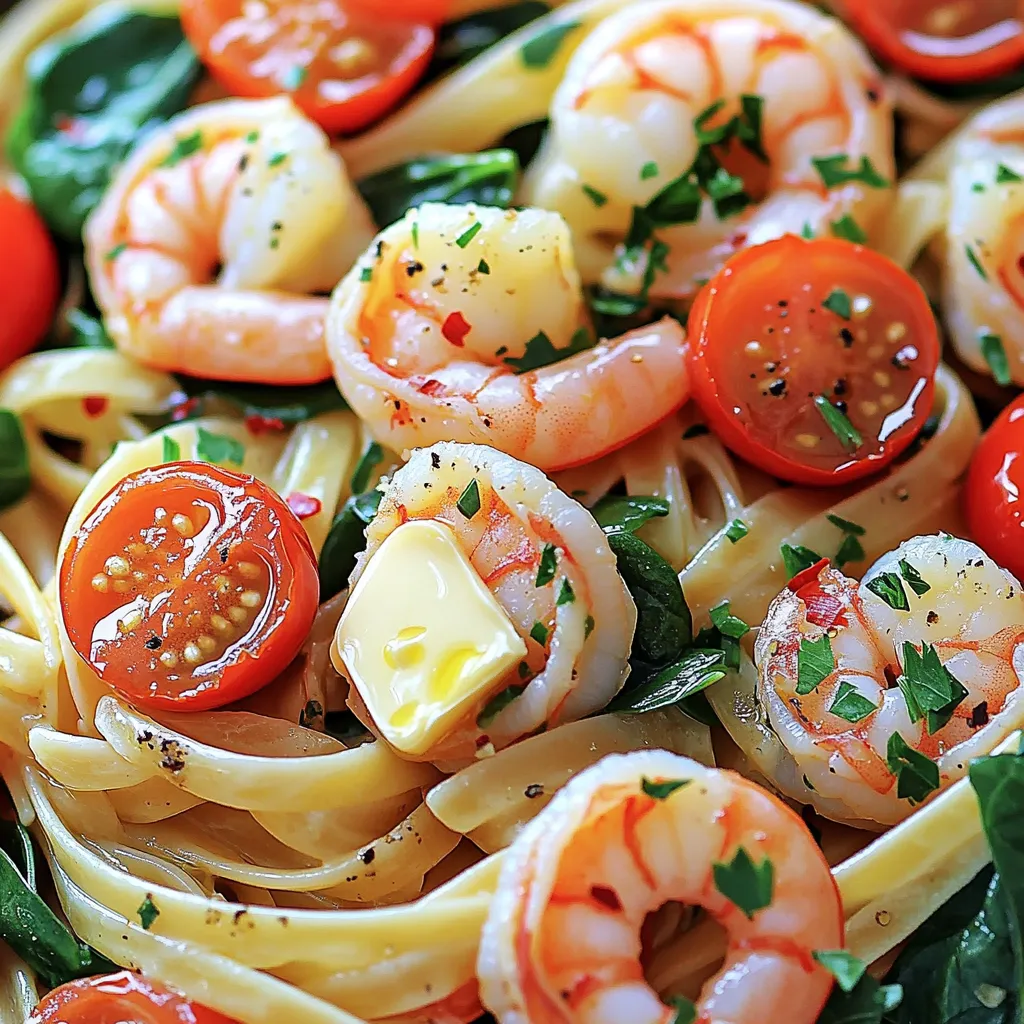 Gather these ingredients before you start cooking. Each one plays a key role. The linguine serves as the base, giving you that perfect pasta bite. Large shrimp add a sweet, juicy element. Unsalted butter is your base for flavor. Garlic brings warmth and depth. Red pepper flakes add a touch of heat. Cherry tomatoes add sweetness and color. Spinach gives a fresh green note. Lemon zest and juice brighten the dish. Salt and pepper help bring out all the flavors. Finally, parsley adds a fresh finish. With these ingredients ready, you can create a dish that sings with flavor!