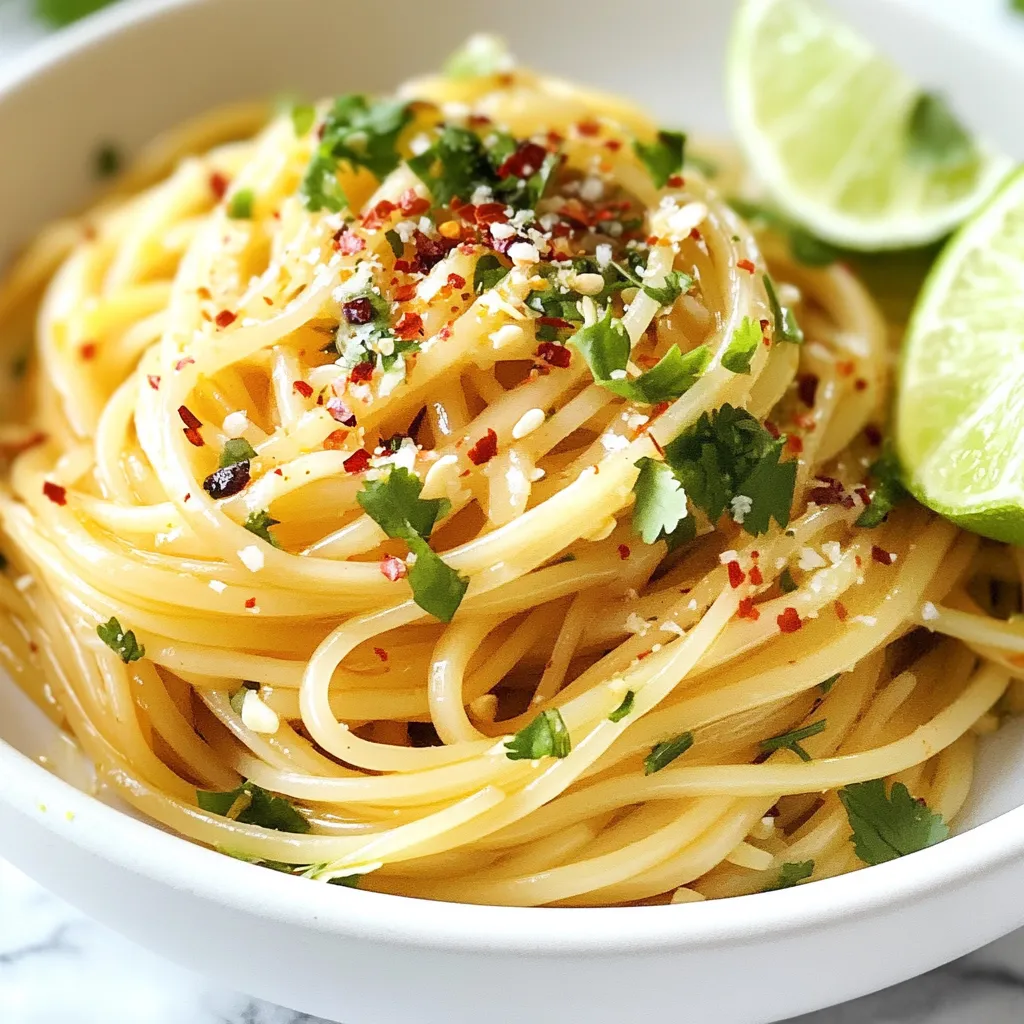 For a beautiful serving, use wide, shallow bowls. This way, the noodles spread out nicely. Add a sprinkle of extra red chili flakes on top for color and spice. You can also zest lime on the dish for a bright look and taste.