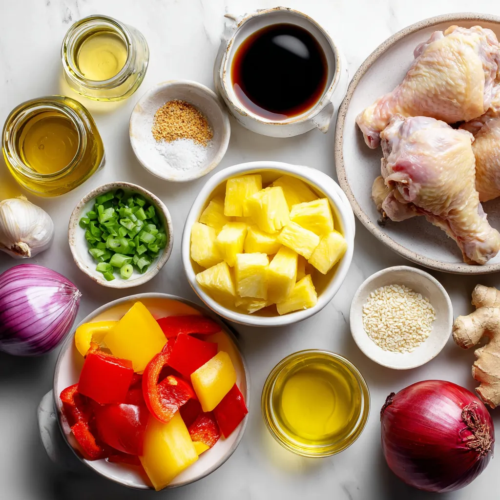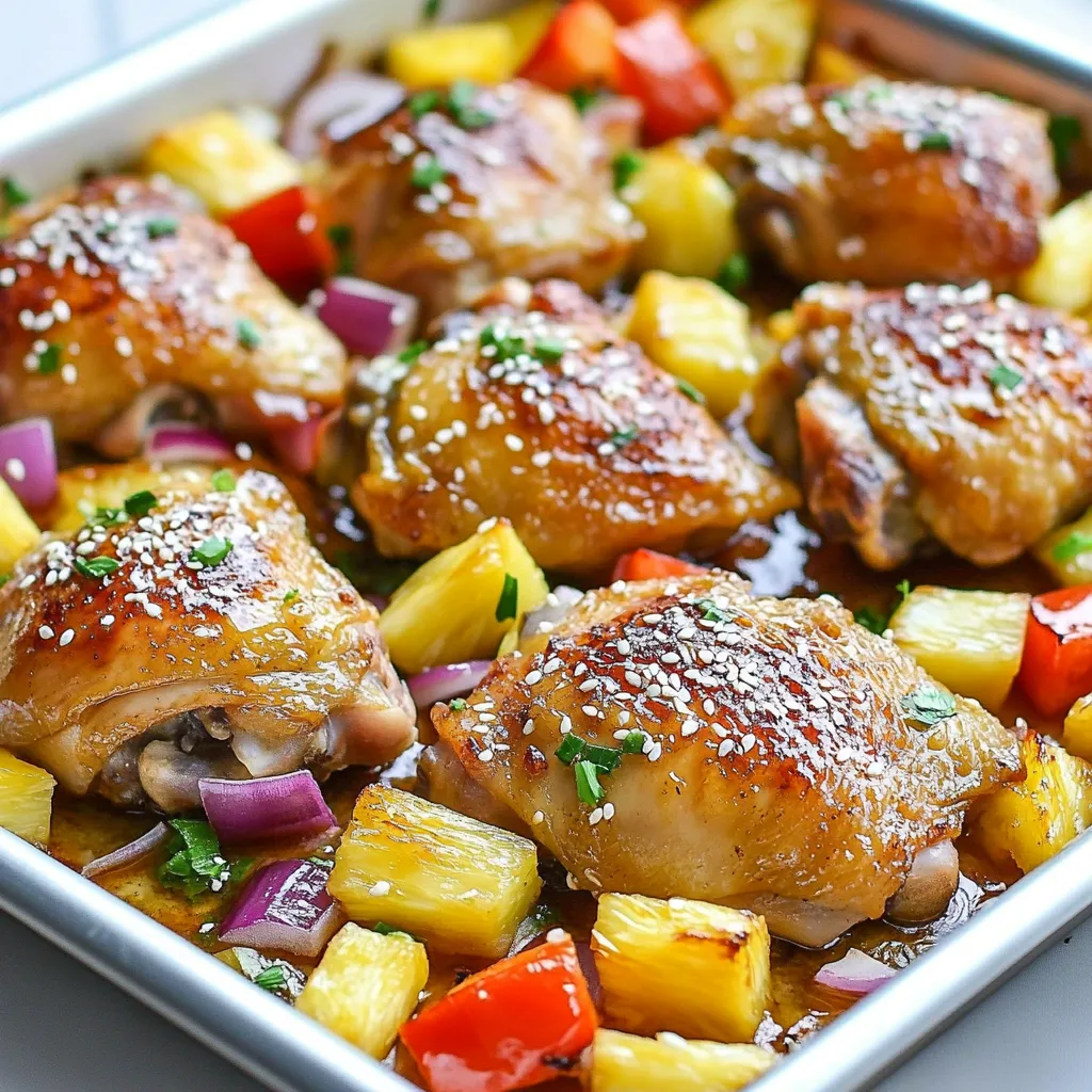 A delicious and colorful sheet pan meal featuring marinated chicken thighs, fresh pineapple, and vibrant vegetables.