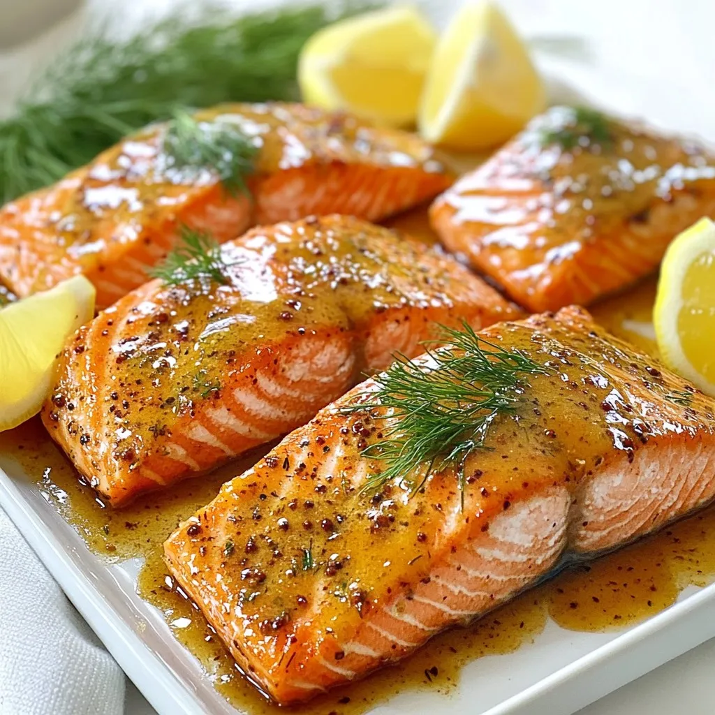 A delicious salmon dish glazed with a sweet and tangy honey mustard sauce.