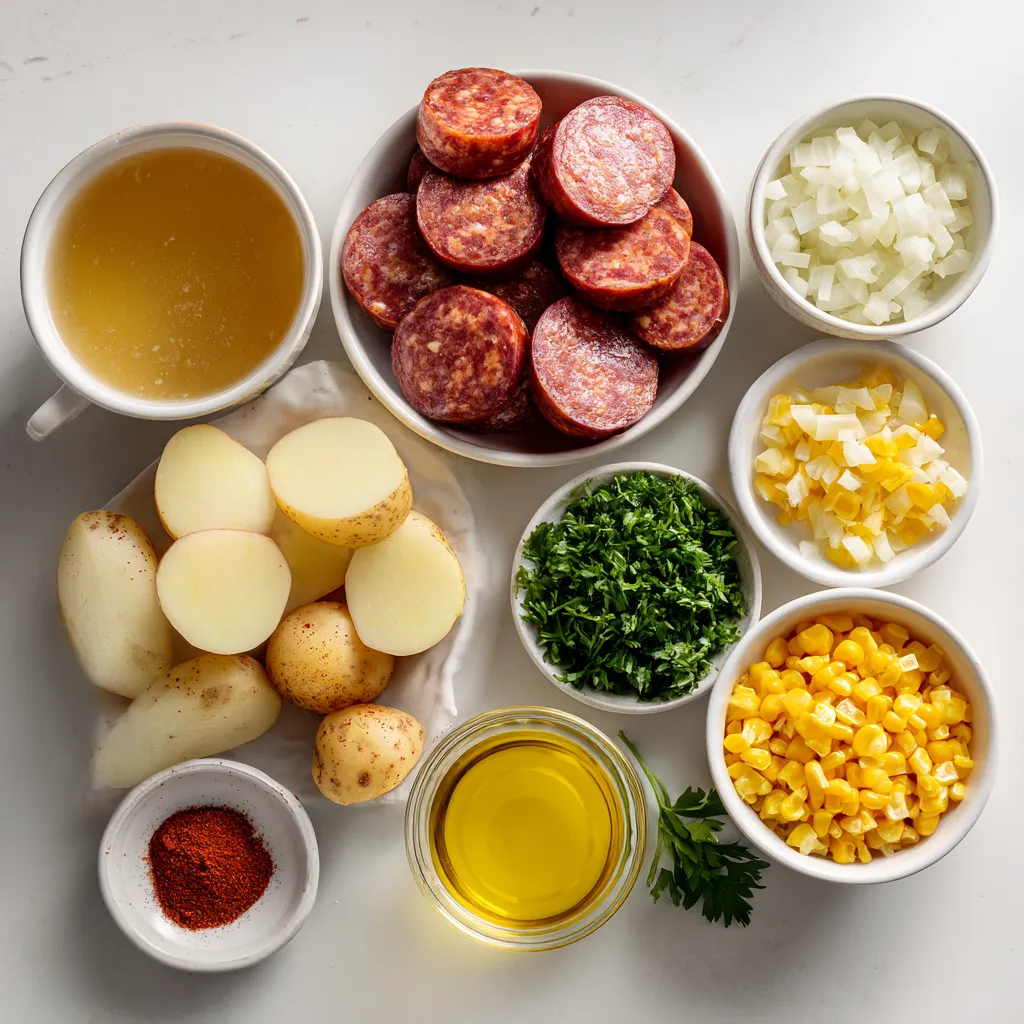 Before cooking, gather all your ingredients. Cut the kielbasa into bite-sized rounds. Peel and cube the potatoes into small chunks. Chop the onion finely and mince the garlic. This makes cooking smoother.