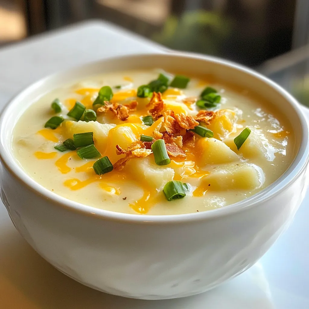 To make loaded potato soup, you need fresh and simple ingredients. Here’s what you’ll need: - 4 large russet potatoes, peeled and diced into 1-inch cubes - 1 medium onion, finely chopped - 3 cloves garlic, minced - 4 cups vegetable broth, homemade or store-bought - 1 cup heavy cream for richness - 1 cup shredded sharp cheddar cheese, plus extra for garnishing - 1/2 cup crispy shallots for topping - 1/4 cup green onions, finely chopped for garnish - 2 tablespoons olive oil for sautéing - Salt and freshly cracked pepper to taste - Pinch of smoked paprika, optional for adding a hint of smokiness These ingredients make a warm and creamy soup. Each one plays a role in creating a rich flavor and smooth texture. The russet potatoes give the soup its heartiness. The onion and garlic add depth to the taste. The vegetable broth serves as the base, while heavy cream and cheddar cheese provide the creamy comfort we crave. Don’t forget the crispy shallots and green onions on top for crunch and freshness! {{ingredient_image_2}} First, grab a large pot or Dutch oven. Pour in two tablespoons of olive oil and heat it over medium heat. When the oil is hot, add one finely chopped onion. Cook it for about five minutes. You want it to be soft and clear. Next, add three minced garlic cloves to the pot. Sauté for one more minute. You will smell that wonderful garlic aroma! Now, mix in four large russet potatoes. Make sure to peel and dice them into one-inch cubes. After adding the potatoes, pour in four cups of vegetable broth. Turn the heat up to high until it boils. Once boiling, reduce the heat to low and let it simmer. This should take about 20 to 25 minutes. Check the potatoes with a fork. They should be fork-tender and break apart easily. Now, take out your immersion blender. Blend the soup right in the pot. You can blend it all for a smooth texture or just half for some chunks. Once blended, it’s time to stir in one cup of heavy cream. Follow that with one cup of shredded sharp cheddar cheese. Heat the soup on low until the cheese melts. Finally, season with salt, cracked pepper, and a pinch of smoked paprika if you like. Serve it hot and enjoy! To boost the taste of your loaded potato soup, you can adjust the seasoning. Start with salt and pepper after blending. Taste the soup and add more if needed. A pinch of smoked paprika adds a nice smoky flavor. Try adding herbs like thyme or rosemary for a fresh twist. To get the right thickness, blend the soup well. If you like a chunkier texture, blend only half the soup. This way, you keep some potato pieces for a hearty feel. If it’s too thick, add more broth or cream until it’s just right. For a fun twist, serve the soup in rustic bread bowls. This adds warmth and a unique touch. You can easily make these bowls by hollowing out small loaves of bread. Garnishing is key to making the soup look inviting. Top each bowl with extra cheddar cheese. Add crispy shallots for crunch. Finally, sprinkle chopped green onions for color. This makes your soup not just tasty but also beautiful. Pro Tips Choose the Right Potatoes: Russet potatoes are ideal for this soup due to their starchy texture, which creates a creamy consistency when cooked and blended. Enhance Flavor with Broth: For deeper flavor, consider using homemade vegetable broth or adding a dash of soy sauce to the store-bought broth. Experiment with Toppings: Feel free to get creative with toppings! Try adding crumbled bacon, sour cream, or fresh herbs for an extra layer of flavor. Storage Tips: This soup stores well in the fridge for up to 3 days. Reheat gently on the stove, adding a splash of broth or cream if it thickens too much. {{image_4}} If you want a vegetarian version, you can swap out the heavy cream and cheese. Use coconut cream instead of heavy cream. It adds a rich taste without dairy. For cheese, try nutritional yeast or a dairy-free cheese. These options give the soup a nice flavor and keep it vegetarian-friendly. For a dairy-free treat, use almond milk or oat milk in place of heavy cream. These milks create a creamy texture without dairy. You can also add pureed cashews for even more creaminess. Just soak cashews in water, blend, and mix them into your soup. Want to spice it up? Add fresh herbs like thyme or rosemary while cooking. For a kick, try a dash of cayenne pepper or chili powder. Smoked paprika adds a nice smoky flavor too. You can even toss in some cooked bacon bits for a savory twist. To store leftovers, let the soup cool to room temperature. Once cooled, transfer it to an airtight container. Be sure to leave some space at the top for expansion. You can keep loaded potato soup in the fridge for up to three days. Always check for freshness before reheating. If it smells off or looks strange, toss it. For freezing potato soup, first cool it completely. Use freezer-safe containers or heavy-duty freezer bags. Leave space at the top for expansion. This soup can last up to three months in the freezer. When you are ready to eat, thaw the soup in the fridge overnight. To reheat, warm it slowly on the stove over low heat. Stir often to keep it smooth. If it seems thick, add some broth or water. This way, you can enjoy creamy comfort again! Yes, you can make loaded potato soup ahead of time. To prepare it in advance, follow these tips: - Cook the soup as directed and let it cool completely. - Store it in an airtight container in the fridge for up to three days. - Reheat gently on the stove, adding a splash of broth or cream if needed. - For best texture, avoid adding toppings until you serve. You can customize this soup with various toppings and mix-ins. Here are some ideas: - Crispy bacon bits for a savory crunch. - Sour cream for extra creaminess. - Fresh herbs like parsley or chives for a bright note. - Roasted vegetables for added flavor. - A drizzle of hot sauce for a spicy kick. Loaded potato soup lasts about three to four days in the fridge. To keep it fresh: - Store it in