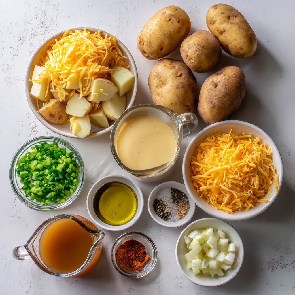These ingredients make a warm and creamy soup. Each one plays a role in creating a rich flavor and smooth texture. The russet potatoes give the soup its heartiness. The onion and garlic add depth to the taste. The vegetable broth serves as the base, while heavy cream and cheddar cheese provide the creamy comfort we crave. Don’t forget the crispy shallots and green onions on top for crunch and freshness!