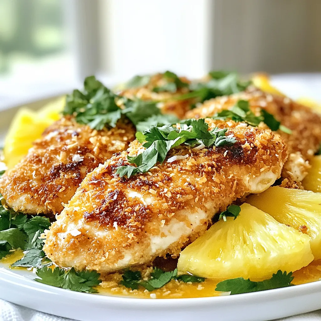 - 4 boneless, skinless chicken breasts - 1 cup shredded coconut - 1 cup panko breadcrumbs - 1 tablespoon garlic powder - 1 tablespoon onion powder - 1 teaspoon paprika - 1 teaspoon salt - ½ teaspoon black pepper - 2 large eggs - ½ cup milk - 1 cup shredded mozzarella cheese - 1 ripe pineapple, sliced into rounds - 1 tablespoon olive oil - Fresh cilantro leaves (for garnish) Each ingredient plays a vital role in making Malibu Chicken tasty. The chicken breasts form the base of the dish. They are lean and cook well. Shredded coconut adds a sweet, tropical flavor. Panko breadcrumbs give a light, crispy texture. Garlic and onion powders add depth. Paprika brings a warm color and slight smokiness. Salt and black pepper enhance all flavors. Eggs and milk create a binding mixture for the coating. Mozzarella cheese melts beautifully, adding creaminess. Pineapple rounds bring a juicy, sweet contrast. Olive oil helps with cooking and flavor. Fresh cilantro adds a burst of freshness at the end. You can easily swap some ingredients if needed. For chicken, use turkey breasts for a leaner option. Almond flour or crushed nuts can replace panko for a gluten-free version. If you dislike coconut, try using crushed cornflakes or breadcrumbs. You can skip the cheese for a dairy-free meal. Instead of pineapple, mango slices offer a similar taste. For the garnish, parsley can replace cilantro if you prefer a milder flavor. These swaps keep the dish simple and delightful while suiting different tastes. {{ingredient_image_2}} 1. Preheat your oven to 375°F (190°C). This step is key for even cooking. 2. Take two large eggs and crack them into a shallow bowl. Add ½ cup of milk. Whisk them together until smooth. 3. In another shallow bowl, combine these dry ingredients: 1 cup shredded coconut, 1 cup panko breadcrumbs, 1 tablespoon garlic powder, 1 tablespoon onion powder, 1 teaspoon paprika, 1 teaspoon salt, and ½ teaspoon black pepper. Mix them well. 4. Grab each chicken breast. First, dip it into the egg mixture, letting any extra egg drip off. 5. Then, coat the chicken with the coconut-panko mix. Press down gently so it sticks well. 1. Place the coated chicken breasts on a greased baking sheet. Make sure to space them out well. 2. Sprinkle 1 cup of shredded mozzarella cheese over each chicken piece. This adds a nice melty layer. 3. Arrange sliced pineapple rounds around the chicken. Brush them lightly with 1 tablespoon of olive oil. This helps enhance flavor and keeps them from sticking. 4. Bake in the preheated oven for 25-30 minutes. Check that the chicken reaches an internal temperature of 165°F (74°C). The coating should look golden brown. 5. Once done, take the baking sheet out of the oven. Let the chicken rest for a few minutes to keep the juices inside. - Make sure to press the coconut-panko mix onto the chicken. This helps it stay on during baking. - Use fresh, ripe pineapples for best flavor. They add sweetness and moisture. - For extra crunch, bake until the coating is a deep golden brown. This will give it a nice crisp texture. - Letting the chicken rest before serving keeps it juicy. Enjoy the flavors! One common mistake is not coating the chicken well. Make sure you press the coconut-panko mix onto the chicken firmly. This helps it stick and get that nice crunch. Also, don’t skip preheating the oven. A hot oven cooks the chicken evenly. Lastly, avoid overcrowding the baking sheet. Keep space between the chicken pieces for better air flow. To make this dish milder, reduce the garlic and onion powder. If you want a spicy kick, add cayenne pepper to the coating. For a fruity twist, try different fruits like mango or peaches instead of pineapple. You can also switch the mozzarella for pepper jack cheese for a bit of heat. Baking is the easiest way to cook this Malibu Chicken. It keeps the chicken moist and the coating crispy. If you want to try frying, use a deep skillet with oil at 350°F. Fry until golden brown, then drain on paper towels. Grilling can add a smoky flavor. Just make sure to monitor the heat so the chicken cooks through. Pro Tips Use Fresh Ingredients: Always opt for fresh chicken and ripe pineapple for the best flavor and texture in your dish. Perfect the Coating: For an extra crispy texture, allow the coated chicken to sit for a few minutes before baking. This helps the coating adhere better. Experiment with Cheese: While mozzarella adds a nice stretch, consider trying other cheeses like provolone or pepper jack for a unique twist. Garnish with Citrus: Adding a squeeze of lime or lemon juice over the finished chicken enhances the tropical flavors beautifully. {{image_4}} You can spice up your Malibu Chicken with various fruits. Try adding mango or kiwi for a sweet twist. You can also use peaches or strawberries, which pair well with coconut. These fruits not only add flavor but also brighten your dish. Slice the fruits and arrange them around the chicken before baking. This makes your meal look fresh and inviting. If you want a lighter option, bake instead of fry. Baking cuts down on oil and calories. You can still get a crispy texture by using panko breadcrumbs. Just remember to watch the cooking time closely. You can also use chicken thighs for more flavor while keeping it healthy. Want to kick up the heat? Add a pinch of cayenne pepper to the coating mix. This gives your dish a nice kick without overpowering the coconut flavor. You can also mix in fresh herbs like basil or parsley. These herbs add depth and freshness to the meal. Don't be afraid to play with flavors and find what you love! To store Malibu Chicken, let it cool first. Place the chicken in an airtight container. You can keep it in the fridge for up to three days. Make sure to separate the chicken from the pineapple. This will keep everything fresh and tasty. If you want to save Malibu Chicken for later, freezing works well. Wrap each piece tightly in plastic wrap. Then, place them in a freezer bag. This will