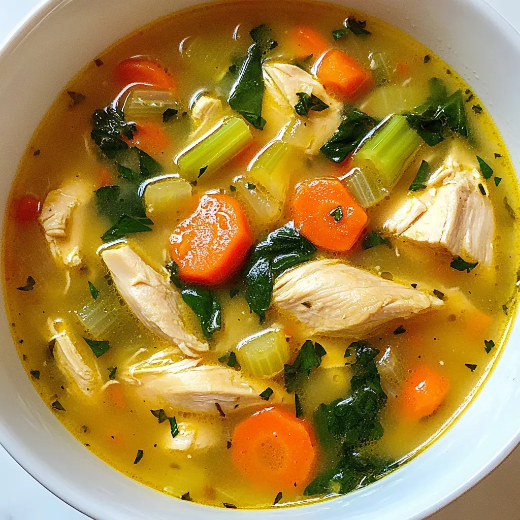- 1 pound boneless, skinless chicken thighs, diced into bite-sized pieces - 2 tablespoons extra virgin olive oil - 3 medium carrots, peeled and sliced into thin rounds - 2 celery stalks, sliced into half-moons - 6 cups low-sodium chicken broth - 1 teaspoon dried thyme - 1 teaspoon dried basil - 1 bay leaf - Salt and freshly cracked black pepper - 1 cup heavy cream or half-and-half - 2 cups fresh spinach, tightly packed - Fresh parsley, finely chopped (for garnish) To make Marry Me Chicken Soup, you need fresh and tasty ingredients. The chicken thighs give the soup a rich flavor. I love using boneless, skinless varieties. They cook quickly and are easy to eat. Olive oil adds a nice, smooth touch. Next, you need fresh veggies. Carrots and celery add crunch and sweetness. They also give the soup a beautiful color. Garlic and onion are key too. They bring out flavors in every bowl. For the broth, low-sodium chicken broth works best. It keeps the soup flavorful without being too salty. Use fresh herbs like thyme and basil for added aroma. A bay leaf enhances the taste even more. Finally, cream or half-and-half makes it rich and creamy. Spinach adds a pop of green and some nutrients. Don't forget the parsley for garnish. It adds a nice touch when serving. This soup is filled with love and warmth, perfect for any day. {{ingredient_image_2}} - Heat 2 tablespoons of extra virgin olive oil in a large pot over medium heat. - Once hot, add 1 pound of diced boneless, skinless chicken thighs. - Season the chicken with salt and freshly cracked black pepper. - Sauté the chicken until it turns golden brown, which takes about 5-7 minutes. - After cooking, remove the chicken from the pot and set it aside. - In the same pot, add 1 medium finely chopped onion, 3 sliced carrots, and 2 sliced celery stalks. - Sauté these vegetables until they soften and the onion becomes clear, which takes about 5 minutes. - Stir occasionally to cook them evenly. - Next, add 3 cloves of minced garlic, 1 teaspoon of dried thyme, and 1 teaspoon of dried basil. - Stir well and cook for 1 minute to blend the flavors. - Carefully pour in 6 cups of low-sodium chicken broth. - Use a wooden spoon to scrape any brown bits from the pot for extra flavor. - Add 1 bay leaf and bring the mixture to a boil. - Once boiling, reduce the heat to low and let it simmer gently. - Return the sautéed chicken to the pot, allowing it to mingle with the broth and veggies. - Simmer for 15-20 minutes until the chicken is fully cooked and tender. - Once cooked, discard the bay leaf from the pot. - Pour in 1 cup of heavy cream and add 2 cups of fresh spinach. - Stir gently and cook for another 2-3 minutes until the spinach wilts. - Taste the soup and adjust seasoning with salt and freshly cracked black pepper if needed. - Serve hot in bowls, garnished with freshly chopped parsley for a bright touch. - How to achieve tender chicken: Use boneless, skinless chicken thighs. They stay juicy and tender. Sauté them in olive oil until golden brown. Remove and set aside to keep them moist. - Tips for the right soup consistency: The cream adds richness. If you want it lighter, use half-and-half. Stir in the cream at the end. This keeps it smooth and creamy. - Ideas for additional spices: Add a pinch of red pepper flakes for heat. A dash of smoked paprika gives depth. Fresh herbs like basil or dill can brighten the flavor. - Best types of olives or cheeses to pair: Feta cheese adds a nice tang. Black olives give a salty bite. Both enhance the dish and add layers of flavor. - Best sides to accompany the soup: Crusty bread is great for dipping. A simple green salad adds freshness. These sides make the meal feel complete. - Recommended garnishes for presentation: Fresh parsley adds color. You can also sprinkle some grated Parmesan. A drizzle of olive oil can enhance the look and flavor. Pro Tips Use Fresh Herbs: Fresh herbs can elevate the flavor of your soup. If you have fresh thyme or basil, feel free to use them instead of dried for a more vibrant taste. Customize Your Vegetables: Don't hesitate to add other vegetables like bell peppers or zucchini. They can add extra nutrition and flavor, making the soup even heartier. Make It Ahead: This soup actually tastes better the next day as the flavors meld. Make a big batch and enjoy the leftovers for a quick meal! Thicken It Up: If you prefer a thicker soup, consider adding a slurry of cornstarch and water or blending a portion of the soup and returning it to the pot for a creamier texture. {{image_4}} You can easily make Marry Me Chicken Soup lighter. Instead of heavy cream, use half-and-half. It gives the same creamy texture but with fewer calories. You can also add more veggies. Consider using zucchini, bell peppers, or green beans. They boost nutrition and add color. More vegetables make the soup heartier and more filling. Want to change the protein? Turkey works well instead of chicken. It has a similar taste and texture. For a plant-based option, use tofu. Just make sure to cube it small. You can also make this soup vegetarian. Swap the chicken broth with vegetable broth. It keeps the flavor rich and satisfying. Add spices for a new flavor profile. For a Mediterranean twist, try dried oregano and lemon zest. They brighten the soup and add depth. You can also incorporate Asian flavors. Add fresh ginger and soy sauce for a unique taste. These twists give the soup an exciting new life and keep it interesting. After you finish your Marry Me Chicken Soup, let it cool down. This helps prevent condensation. Use a large spoon to scoop the soup into containers. Choose airtight containers to keep it fresh. Glass or BPA-free plastic containers work great. Avoid using metal containers, as they can affect the soup's taste. When reheating, I recommend using the stovetop. Pour the soup into a pot over low heat. Stir it often to keep it from sticking. You can also use the microwave. Just cover the bowl and heat in short bursts. C
