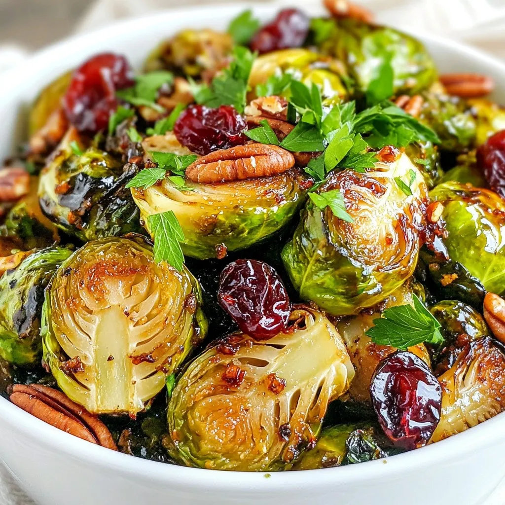 A delicious side dish featuring roasted Brussels sprouts combined with crunchy pecans and sweet cranberries.