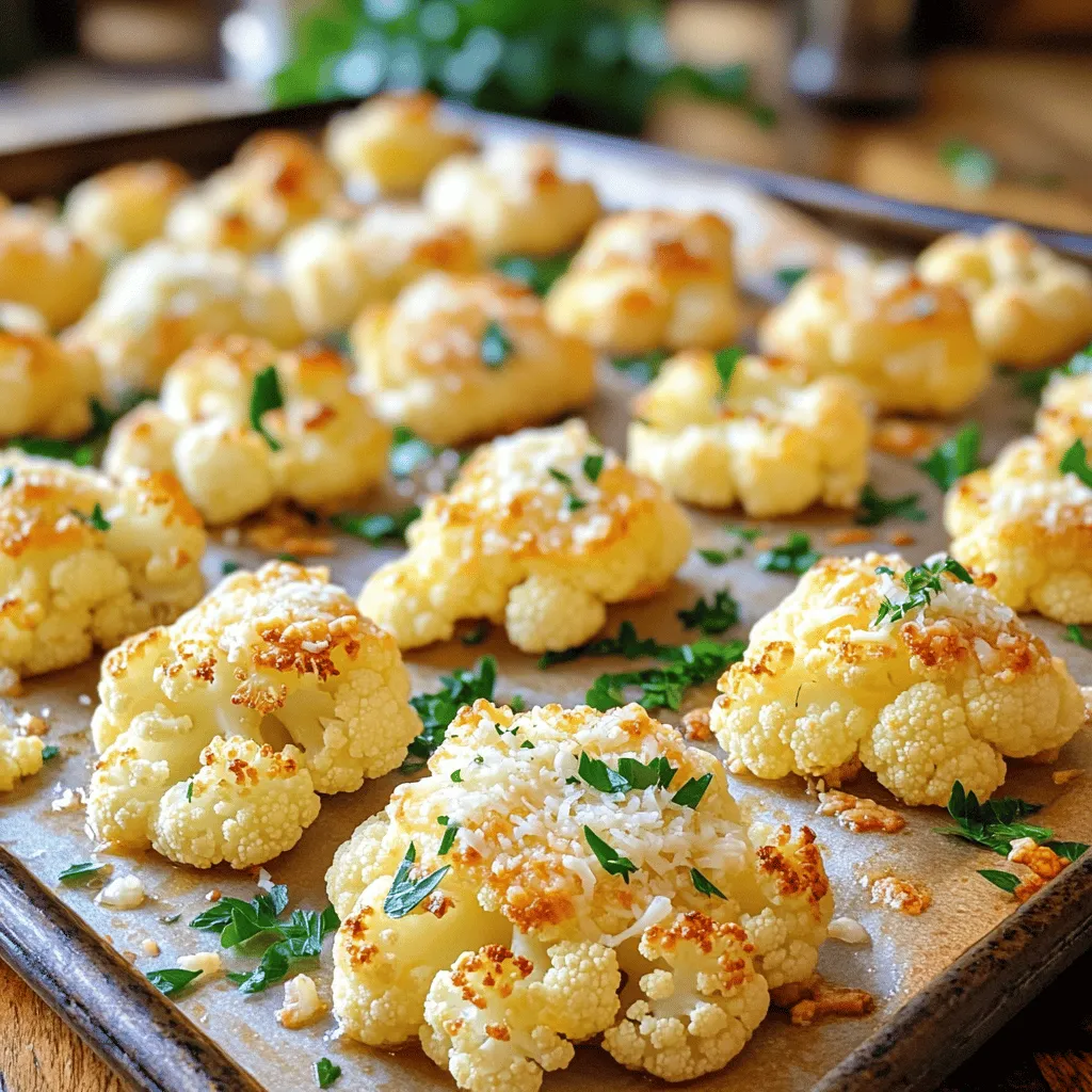 ![- 1 large cauliflower head, cut into bite-sized florets - 4 cloves garlic, finely minced - 3 tablespoons extra virgin olive oil - ½ cup freshly grated Parmesan cheese - 1 teaspoon dried oregano - 1 teaspoon smoked paprika - Sea salt and freshly cracked black pepper, to taste - Fresh parsley, finely chopped (for a vibrant garnish) Roasted Garlic Parmesan Cauliflower is a treat. The main star is the cauliflower florets. They soak up all the flavors. Garlic adds a nice punch. I love using fresh garlic. It gives the dish depth. The olive oil helps the florets roast nicely. It keeps them moist while they cook. Parmesan cheese brings that salty, cheesy goodness. It melts and crisps on top. This creates a tasty layer. Spices like oregano and smoked paprika add warmth. They elevate the dish with rich flavors. Sea salt and pepper make everything pop. Lastly, a sprinkle of parsley adds color. It makes the dish look fresh and inviting. You can find the full recipe above. It shows how to mix these ingredients perfectly. Enjoy crafting this side dish that everyone loves! 1. Preheat the oven. Set your oven to 400°F (200°C). This helps the cauliflower roast evenly and get crispy. 2. Prepare the marinade. Grab a large bowl. Mix together: - 3 tablespoons extra virgin olive oil - 4 cloves garlic, finely minced - 1 teaspoon dried oregano - 1 teaspoon smoked paprika - Sea salt and freshly cracked black pepper to taste Whisk these ingredients until smooth and aromatic. 3. Toss cauliflower in the marinade. Cut 1 large cauliflower head into bite-sized florets. Add the florets to the bowl. Use your hands or a spatula to coat each piece well. This ensures every bite is packed with flavor. 1. Spread cauliflower on the baking sheet. Line a large baking sheet with parchment paper. This makes cleanup easy. Spread the marinated cauliflower in a single layer. This allows for even roasting. 2. Toss during roasting for even cooking. Place the baking sheet in the oven and roast for 25-30 minutes. Halfway through, take the sheet out and carefully toss the florets. This helps them cook evenly and turn golden brown. 3. Add Parmesan at the end. Once the cauliflower is roasted, take it out of the oven. Sprinkle ½ cup freshly grated Parmesan cheese over the hot cauliflower. Return it to the oven for 5 more minutes. This melts the cheese and adds a nice crispy layer. For the complete recipe, you can check the [Full Recipe]. - For crispy texture, make sure to space the florets. Crowded florets steam instead of roast. - Toss the cauliflower halfway through cooking. This helps achieve even browning and tenderness. - Adjust your seasonings based on your taste. You can add more garlic for stronger flavor or more salt to enhance taste. - Serve the cauliflower on a rustic wooden platter for a homey feel. - Add fresh parsley on top for a colorful garnish. This brightens the dish and adds flavor. - Use a colorful bowl to make the dish pop on the table. It draws attention and makes it more inviting. For the full recipe, check the details above! {{image_4}} You can make roasted garlic Parmesan cauliflower even more fun. Here are some tasty ideas: - Adding different cheeses: Try mixing in cheddar, feta, or goat cheese. Each cheese gives a unique taste. - Incorporating more vegetables: Toss in bell peppers, carrots, or Brussels sprouts. They roast well and add color. - Using different herbs and spices: Experiment with thyme, rosemary, or chili flakes. Each adds a new twist. If you have specific dietary needs, you can still enjoy this dish. - Gluten-free options: This recipe is naturally gluten-free. No changes are needed. - Vegan adaptations: Swap Parmesan cheese with nutritional yeast or vegan cheese. You still get a great flavor. - Low-carb substitutes: Instead of cauliflower, try broccoli or zucchini for a low-carb option. They roast nicely too. Feel free to explore these variations. You can find the [Full Recipe](#) for more details on how to make this dish. To keep your roasted garlic Parmesan cauliflower fresh, store it properly. First, let it cool down after cooking. Then, place the leftovers in an airtight container. This helps keep the flavors intact and prevents spoilage. Store the container in the fridge. The cauliflower stays good for about 3 to 5 days. If you want to save it longer, freezing is a great option. To freeze, use a freezer-safe container. You can also use a freezer bag. Just make sure to remove as much air as you can. This keeps the cauliflower from getting freezer burn. It can last for up to 3 months in the freezer. To reheat roasted cauliflower without losing its tasty texture, use the oven. Preheat it to 350°F (175°C). Spread the cauliflower on a baking sheet. Bake it for about 10 to 15 minutes. Toss it halfway through to help it heat evenly. You can also reheat it in a skillet. Heat the skillet over medium heat. Add a little olive oil if you like. Toss the cauliflower gently until it warms up. This method helps keep the flavors strong. For both methods, avoid using the microwave. It can make the cauliflower soggy. By reheating properly, you can enjoy every bite again, just like fresh from the oven. How long does roasted cauliflower last? Roasted cauliflower lasts about 3 to 5 days in the fridge. Store it in an airtight container. This keeps it fresh and tasty for later. Can I prepare this dish in advance? Yes, you can prepare it in advance! You can marinate the cauliflower the day before. Just keep it in the fridge until you’re ready to roast. What can I serve with Roasted Garlic Parmesan Cauliflower? This dish pairs well with many meals. Try serving it with grilled chicken, steak, or fish. It also goes great with quinoa or rice for a complete meal. Caloric content and macronutrient breakdown One serving of Roasted Garlic Parmesan Cauliflower contains about 150 calories. It has 8 grams of carbs, 6 grams of protein, and 12 grams of fat. Health benefits of cauliflower Cauliflower is low in calories and h