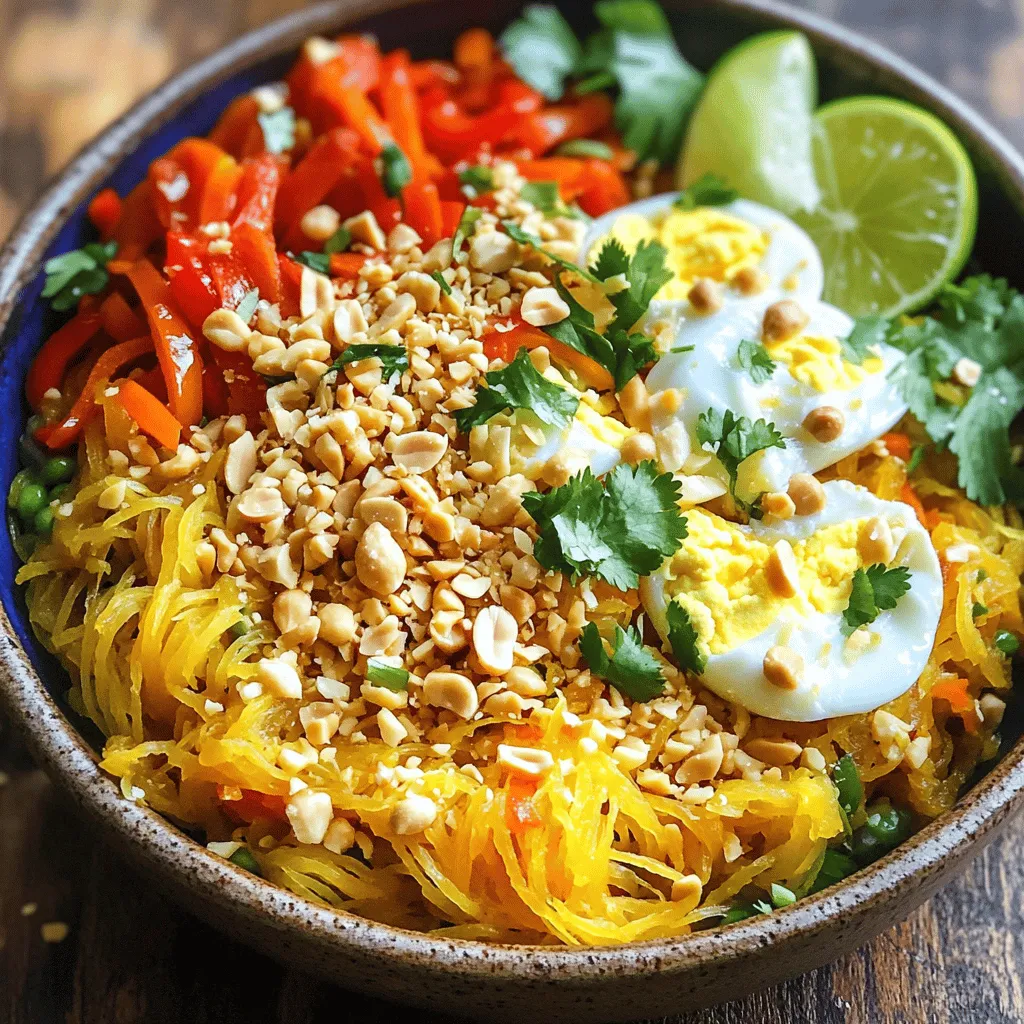 To create a tasty Spaghetti Squash Pad Thai, gather these key ingredients: - 1 medium spaghetti squash - 2 tablespoons vegetable oil - 2 cloves garlic, minced - 1 red bell pepper, thinly sliced - 1 cup bean sprouts - 2 green onions, sliced - 1 carrot, julienned - 2 large eggs, lightly beaten (or flax eggs for a vegan alternative) - 3 tablespoons tamari or soy sauce - 1 tablespoon creamy peanut butter - 1 tablespoon fresh lime juice - 1 teaspoon sugar - Crushed peanuts and fresh cilantro for garnish - Lime wedges for serving These ingredients blend together to create a vibrant dish. The spaghetti squash adds a unique texture, while the veggies offer color and crunch. For extra flavor and flair, consider these optional garnishes: - Crushed peanuts - Fresh cilantro leaves - Lime wedges Using these garnishes enhances the dish's visual appeal and taste. They help balance the flavors and add a fresh touch. You can easily modify this dish to suit dietary needs. Here are some substitutions: - Use zucchini noodles instead of spaghetti squash for a low-carb option. - Swap eggs for tofu or chickpeas to make it vegan. - Choose coconut aminos instead of soy sauce for a gluten-free option. These substitutes make the recipe flexible. You can enjoy this dish no matter your dietary preferences. For the full recipe, check out the provided link! To start, preheat your oven to 400°F (200°C). Cut your spaghetti squash in half lengthwise. Use a spoon to scoop out the seeds. Place the squash halves cut side down on a lined baking sheet. Roast in the oven for 30 to 40 minutes. The flesh should feel tender when done. Let it cool for a few minutes. Now, take a fork and shred the flesh into strands. This will give you those lovely spaghetti-like noodles. Next, take a large skillet and heat vegetable oil over medium heat. Add minced garlic and cook for about 30 seconds. You want it to smell great, not burn. Now, add the red bell pepper and julienned carrot. Stir-fry them for 3 to 4 minutes. You want them to soften and look vibrant. This mix adds color and crunch to your dish. In the skillet, push the veggies to one side. Pour in the lightly beaten eggs on the other side. Scramble them until cooked. Then, mix the eggs with the veggies. This makes a tasty base. Now, add the shredded spaghetti squash and fold it in. In a small bowl, whisk together tamari (or soy sauce), peanut butter, lime juice, and sugar. Drizzle this sauce over your mixture and toss it all together. Finally, fold in the bean sprouts and green onions. Cook for another minute to warm everything. Your dish is now ready to enjoy! For the complete details, check the Full Recipe. To cook spaghetti squash perfectly, choose a medium-sized squash. Cut it in half lengthwise and scoop out the seeds. Place it cut-side down on a baking sheet lined with parchment paper. Roast it at 400°F (200°C) for 30-40 minutes. You want the flesh to be soft enough to shred easily with a fork. Let it cool before using a fork to create those lovely spaghetti-like strands. For the sauce, mix tamari or soy sauce with creamy peanut butter, lime juice, and a bit of sugar. Whisk until smooth for the best flavor. Pour it over the squash and veggies in the skillet. Toss everything well so each strand is coated evenly. This step makes your dish flavorful and rich. When serving your spaghetti squash Pad Thai, use a large white platter for a clean look. Garnish generously with crushed peanuts and fresh cilantro. Place lime wedges around the dish for color and zest. This not only makes it pretty but also adds a fresh taste. For a fun touch, serve it in individual bowls, letting guests customize with extra lime or peanuts. For the complete guide to making this dish, check out the Full Recipe. {{image_4}} If you want a vegan dish, you can skip the eggs. Instead, use flax eggs. To make a flax egg, mix one tablespoon of ground flaxseed with three tablespoons of water. Let this sit for five minutes until it thickens. This mixture will help bind your ingredients just like eggs do. This recipe is naturally gluten-free when you use tamari instead of soy sauce. Tamari is made without wheat, making it a great choice. Always check the labels to ensure your other ingredients, like peanut butter, are gluten-free too. You can boost the protein in your dish easily. For a vegetarian option, add firm tofu. Cut it into cubes and sauté it until golden. For a meaty touch, add chicken or shrimp. Cook them in the skillet before adding the vegetables. This will enhance the flavor and keep everything well-balanced. To keep your Spaghetti Squash Pad Thai fresh, store it in an airtight container. Let it cool first, then place it in the fridge. It will last for up to three days. Keeping the sauce and squash separate helps maintain texture. When you're ready to enjoy leftovers, heat them in a skillet over medium heat. Add a splash of water or oil to prevent sticking. Stir well until everything is hot. You can also microwave it in a bowl with a lid. Heat for one to two minutes, stirring halfway through. You can freeze this dish if you need to store it longer. Pack it in a freezer-safe container after cooling. It’s best used within three months. To thaw, leave it in the fridge overnight. Reheat it as described above for the best taste and texture. For the full recipe, check out the Spaghetti Squash Pad Thai section. You can tell the spaghetti squash is done when it is tender. To check, poke it with a fork. If it easily pierces the flesh, it's ready. The skin should feel soft to the touch. After roasting, let it cool a bit. Then, use a fork to shred it into strands. This creates that lovely noodle-like texture we want. Yes, you can use traditional noodles. However, this changes the dish's character. Spaghetti squash gives a unique twist to Pad Thai. It makes the dish lighter and adds more fiber. If you choose noodles, cook them as directed. Then, mix them with the same tasty sauce and veggies. You can use almond