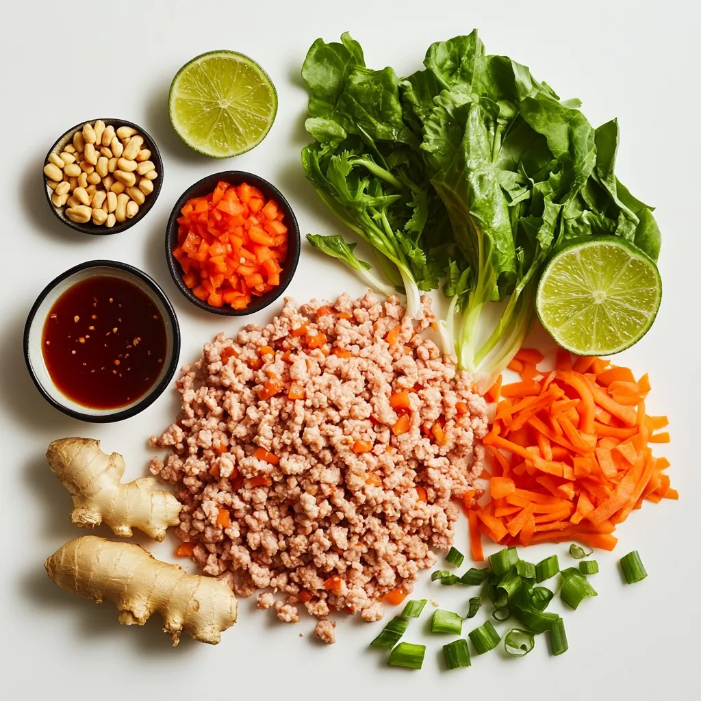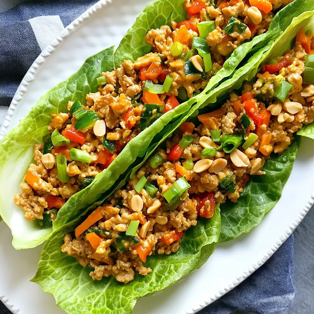 To make Thai Peanut Chicken Lettuce Wraps, you will need some fresh and tasty ingredients. Here’s what you need: - 1 lb ground chicken - 1 tablespoon sesame oil - 2 tablespoons fresh ginger, minced - 3 cloves garlic, minced - 1 red bell pepper, diced - 1 cup shredded carrots (about 2 medium carrots) - ¼ cup green onions, finely chopped - ½ cup roasted peanuts, coarsely chopped - 3 tablespoons soy sauce (or tamari for gluten-free option) - 2 tablespoons creamy peanut butter - 1 tablespoon fresh lime juice - 1 teaspoon sriracha (adjust based on your heat preference) - 1 head of butter lettuce or iceberg lettuce, leaves gently separated Each ingredient brings its own flavor. The ground chicken is the main protein. Ginger and garlic add a warm spice. The red bell pepper and carrots give color and crunch. Soy sauce and peanut butter create a rich sauce. Sriracha adds a touch of heat. The lettuce acts as a fresh wrap. You can choose butter or iceberg lettuce. This keeps everything light and fun. Using fresh, quality ingredients makes a big difference. They help create a dish that is not only tasty but also healthy. Enjoy the vibrant flavors and textures in every bite! {{ingredient_image_2}} Heating the Skillet and Sautéing the Chicken Start by heating 1 tablespoon of sesame oil in a large skillet over medium heat. You want the oil to shimmer. Once it's ready, add 1 pound of ground chicken. Use a wooden spoon to break the chicken apart. Cook it for about 5 to 7 minutes. Stir occasionally until the chicken turns brown and is fully cooked. Adding Aromatics and Vegetables Next, add 2 tablespoons of minced ginger, 3 cloves of minced garlic, 1 diced red bell pepper, and 1 cup of shredded carrots to the skillet. Stir everything together and sauté for another 3 to 4 minutes. Your goal is to make the veggies tender and aromatic. This step adds great flavor to your chicken mixture. Whisking Ingredients for the Peanut Sauce In a separate small bowl, whisk together 3 tablespoons of soy sauce, 2 tablespoons of creamy peanut butter, 1 tablespoon of fresh lime juice, and 1 teaspoon of sriracha. Mix it well until you get a smooth sauce. This peanut sauce will bring all the flavors together. Mixing in Sauce with Chicken and Vegetables Pour the peanut sauce over the chicken and veggie mix in the skillet. Stir everything well to coat the chicken and vegetables evenly. Heat the mixture for about 2 more minutes until it's warmed through. Filling and Rolling the Lettuce Wraps Take a head of butter or iceberg lettuce and gently separate the leaves. Spoon a generous portion of the chicken mixture onto the center of each leaf. Roll it up like a taco, enclosing the filling. Your wraps are now ready to serve! Enjoy this quick and tasty meal with friends or family. Best Types for Wrapping For Thai peanut chicken lettuce wraps, use butter or iceberg lettuce. Butter lettuce has soft, pliable leaves that wrap easily. Iceberg offers a nice crunch. Both types hold the filling well without tearing. Storage Tips for Lettuce To keep your lettuce fresh, store it in the fridge. Place it in a plastic bag with a paper towel. This helps absorb extra moisture. Keep the lettuce away from strong-smelling foods. This prevents it from taking on unwanted flavors. Adjusting Spice Levels with Sriracha Sriracha adds a nice kick to the wraps. If you like it spicy, use the full teaspoon. For less heat, add half a teaspoon or skip it altogether. You can always serve sriracha on the side for those who want more spice. Substitutions for Dietary Restrictions If you have dietary restrictions, there are easy swaps. Use ground turkey or beef instead of chicken. For a vegetarian option, try crumbled tofu. Swap soy sauce for tamari to make it gluten-free. Arrangement Tips for Serving To impress your guests, arrange the filled wraps on a large platter. Keep them neat and tidy. This makes them look inviting and fun to eat. Garnishing Suggestions Garnish your wraps with extra chopped peanuts and green onions. This adds color and texture. Serve with lime wedges for a fresh burst of flavor. Let guests squeeze lime juice on their wraps before eating. Pro Tips Prep Your Ingredients: Before you start cooking, have all your ingredients chopped and ready to go. This will streamline the process and ensure you don’t miss any key components while cooking. Adjust the Heat: If you prefer a milder flavor, reduce the amount of sriracha or omit it altogether. You can also serve it on the side for guests to add according to their taste. Use Fresh Ingredients: For the best flavor, opt for fresh ginger and garlic rather than pre-minced varieties. Fresh ingredients will enhance the overall taste of your dish. Experiment with Lettuce: While butter lettuce is great, feel free to try other types like romaine or even collard greens for a different texture and flavor in your wraps. {{image_4}} You can switch the ground chicken for ground turkey or beef. Each choice brings a unique flavor. Ground turkey is leaner, while ground beef offers a richer taste. For a vegetarian option, use tofu. Firm tofu works best. Just press it to remove excess water. Crumble the tofu and cook it as you would the chicken. It absorbs flavors well, making it a tasty choice. If you need a nut-free option, use sunflower seed butter. It provides a similar creaminess without the nuts. You can also try tahini for a different flavor. For sweet and spicy variations, add honey or maple syrup to the sauce. This will balance the heat from the sriracha. You can also mix in chili paste for an extra kick. Serve your wraps with fresh veggies like cucumber or bell pepper sticks. They add a nice crunch and freshness. A side of rice or quinoa can make it a full meal. Try adding a light dipping sauce, like soy sauce or a lime vinaigrette. This adds flavor and makes each bite exciting. Enjoy the fun of mixing and matching your wraps! To keep your Thai peanut chicken lettuce wraps fresh, store them properly. Use an
